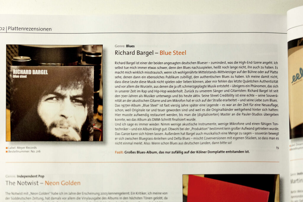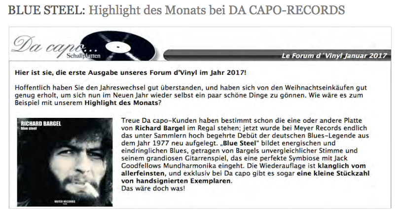 DIE NOTE SEHR GUT … erhielt die Neuauflage meiner ersten LP „Blue Steel“ (MeyerRecords/Vertrieb Rough Trade) von Vincent Abbate, Platten-Rezensent des Magazins ROCKS. Und so erschien sie auch direkt an erster Stelle auf der Seite mit den Neuerscheinungen! Weil dies so schön ist, habe ich für euch die Kritik beigefügt: PLATTENDEBUT DER KULTFIGUR Früher war alles anders: Den Blues gab es nicht wie heute in jedem Kaff und in jedem Kulturzentrum zu hören. Als „Blue Steel“ 1977 erschien, war diese Musik in der Bundesrepublik noch recht exotisch. Und Richard Bargel, als Westdeutscher, der sich dem ursprünglichen Bottleneck-Blues aus dem Mississippi-Delta verschrieben hatte, war selbst Exot. Die Archivfotos vom damaligen Straßenkünstler im CD-Inneren (sowie in der hübschen Vinyl-Ausgabe) belegen dies eindrucksvoll. Vierzig Jahre später überrollen einen die zwölf Titel der Originalausgabe mit einer wilden, ungestümen Energie, die von dem flinken Gitarrenspiel und der grölenden Stimme des meist solo auftretenden Protagonisten ausgeht. Blueshelden wie Son House und Bukka White waren im Bewusstsein des Kölners sicherlich noch stark verankert, einen gewissen Folksänger aus Minnesota muss er aber auch schon mal gehört haben. Bargels Ansehen als Urgestein des deutschen Blues kann diese willkommene Neuauflage nur steigern, zumal die remasterten Aufnahmen in Sachen Klangqualität nichts zu wünschen übrig lassen.