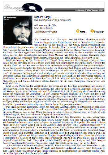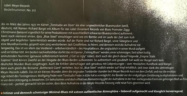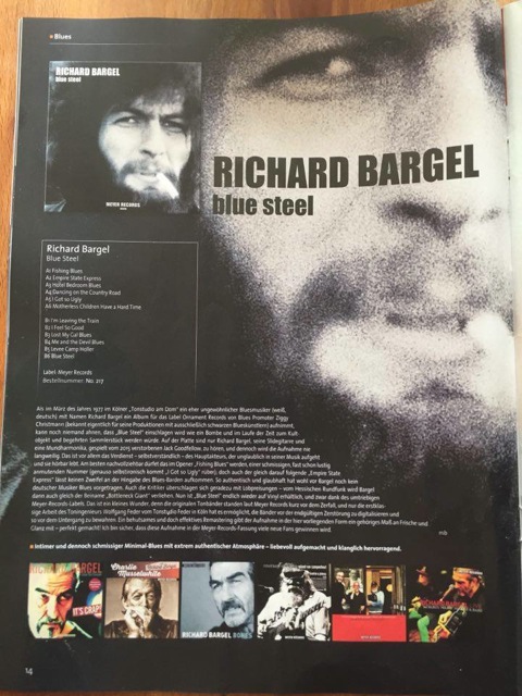 Sehr geehrte Damen und Herren, liebe Musik- und Kunstfreunde, es ist erst ein paar Wochen her – ich kam gerade von den Inseln – da besuchte ich meinen alten Weggefährten Richard. Wir saßen wie so oft in seiner gemütlichen Küche, sprachen über dies und das, und erinnerten wie wir vor jetzt zehn Jahren das erste gemeinsame Projekt auf den Weg brachten. („Bones“, Meyer Records MR 151CD+152 LP). Eigentlich geplant aber war schon in 2006 eine Neuauflage seines legendären 1977er Albums „Blue Steel“. Übrigens auch mein erstes Richard Bargel-Blues-Album – ich hatte es in den achtziger Jahren mit einer (leider nicht mir gewidmeten) Signatur versehen erstanden. Second hand übrigens, was heute nicht mehr nötig wäre, weil alle unsere VÖ’s von Richard Bargel auch signiert bei „Da capo“ und „JPC“ im online-Versand erhältlich sind. Nun, jetzt kommts: wir bringen das bei Sammlern so begehrte Kult-Objekt in einer sorgfältig von den Original-Analogbändern remasterten Neupressung auf Vinyl und erstmals auch auf CD heraus. Ziggy Christmann, Co-Produzent und Labelinhaber vom früherem „Ornament Record-label“ hatte die Tapes verwahrt und mit großem Können hat Wolfgang Feder der Guru unter den Tontechnikern, diese durch Aufbacken! im Spezialofen noch einmal zur Überspielung aktivieren können, bevor die alterungsbedingt abgelöste Magnetschicht eine Restaurierung nicht mehr möglich gemacht hätte. Hut ab! Unser Vertrieb Rough Trade wird die Platte Ende November in die Läden bringen.